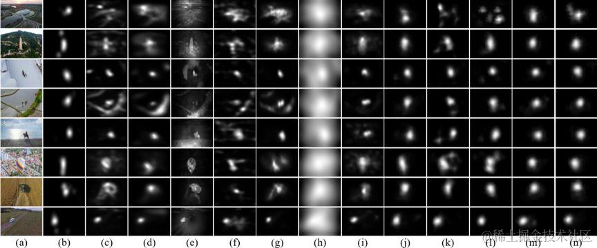 表 5:AVS1K 数据集上的代表性帧结果. (a) Video frame, (b) Ground truth, (c) HFT, (d) SP, (e) PNSP, (f) SSD, (g) LDS, (h) eDN, (i) iSEEL, (j) DVA, (k) SalNet, (l) STS, (m) UVA-DVA-32, (n) UVA-DVA-64.\