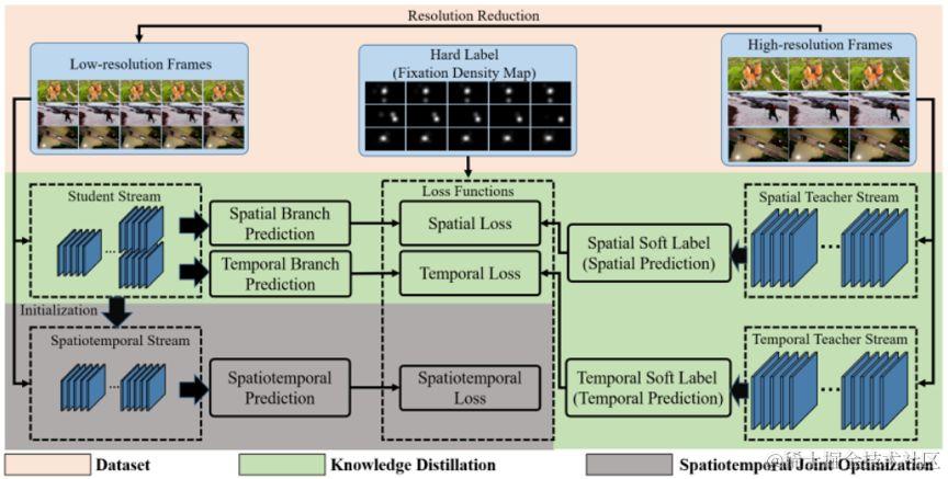 作者采用耦合知识蒸馏的方法来进行网络的训练,该方法首先使用低分辨率视频帧作为输入,在尽可能保留视频显著区域检测所需的时域和空域信息的前提下,减少网络的计算量;然后利用结构复杂的时域和空域网络作为教师模型,以耦合知识蒸馏的方式,监督训练结构简单的时空联合的学生模型,大幅度降低了模型参数规模和对存储空间的需求。具体如图 6 所示。