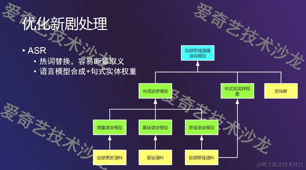 除此之外,我们还会把视频领域的语料句式和实体抽取出来,以此反映实体库的变化,实体库的片名、演员名、导演名等类型的实体可以以相同的权重去替换合成语言模型当中同类的词,即只有当语言模型认为下一个词是演员的时候才会尝试匹配“演员”实体库中所包含的实体路径,这样就使得整个语言模型能够非常快的受到实体库变化的影响,同时其也不会因为部分文本片段而强行错误覆盖那些不需要去替换的别的词。以上是我们在ASR这部分做的工作。