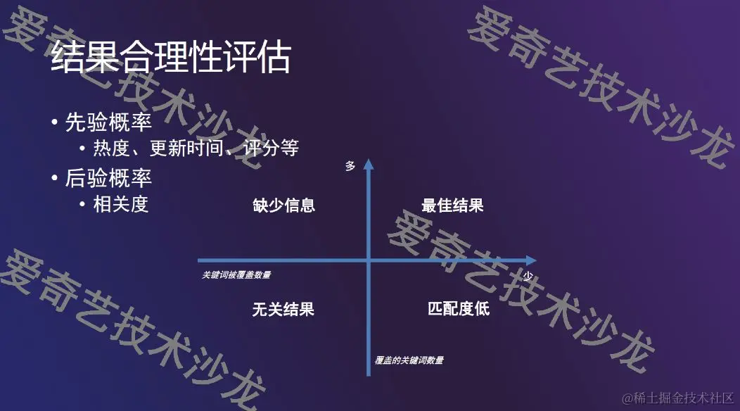 此时,我们需要思考一个问题——怎么判断结果到底是不是合理的?为什么中国新说唱跟电影放在一起就不合理?爱情公寓和电影放在一起就合理呢?在进行合理性评估讲述的这一部分,我们首先看一个先验概率,先验概率用来评价一部影片本身热度高不高,是不是最近才更新的,先验概率客观的决定了一部剧被用户选中的概率是高还是低,后验的概率代表了这部剧和用户的的关联度及相关度是不是够高,其中相关度的判断和常规的去判断关键词是否被覆盖有些不同,其主要从两个维度进行判断,在如图的搜索集合中,横坐标是关键词被覆盖的数量,其越少越好,新增加的条件应该在旧的结果当中起到选择的作用,而不是没有增加信息量,这就是所谓的关键词被覆盖的数量要越少越好。