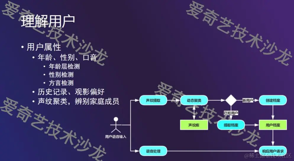 于是,我们引出了这样一个技术,通过声纹聚类,无监督聚类的方式来辨别家庭成员,在每台设备上配置一个声纹库。当一个用户进行输入的时候,系统对声音进行语音处理的同时对他的声纹进行提取,如果这个声纹是之前已经出现过的,我们就会把他的档案归到之前已经存在的这个用户的档案里边,如果发现这是一个新用户的话,我们会为他建立一个新的档案,因此在不同家庭成员不断使用这个设备之后,系统可以分辨出来不同家庭成员的需求与喜好,学习到奶奶平时喜欢看宫斗剧,小朋友喜欢看动画片,比如光头强或者小猪佩奇等等。基于声纹的用户档案建立之后,语音交互设备在家庭的场景当中也可以比较精确的对用户的历史记录、观影偏好进行追踪,从而能够做到更好的个性化推荐。