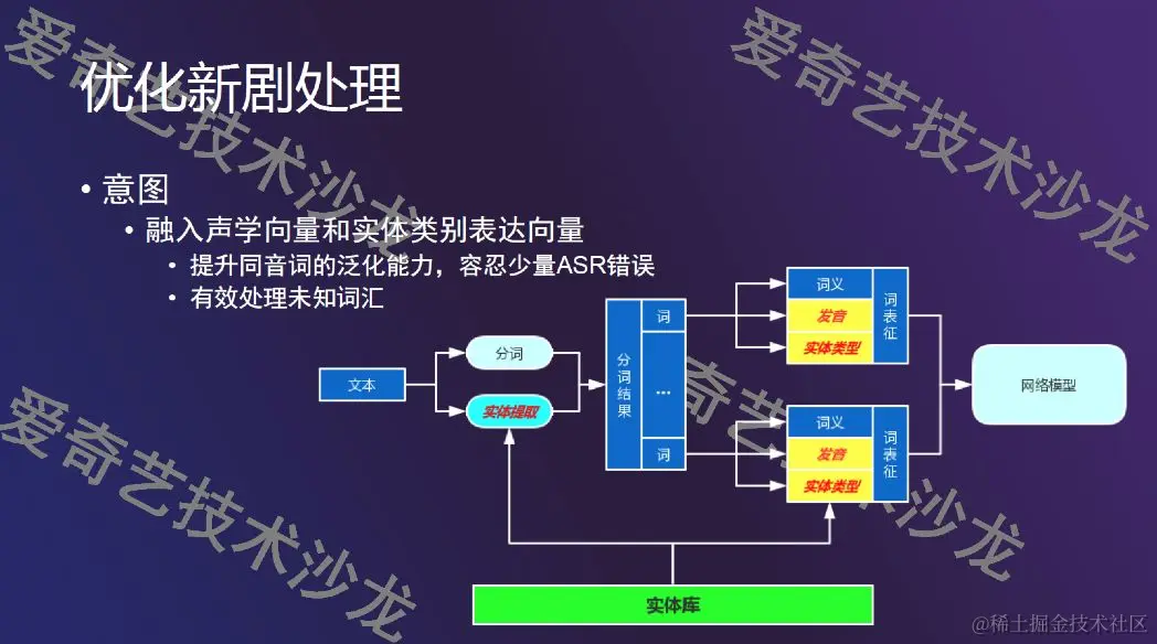 但是,在这其中存在一个问题,用户点播的热点常聚焦在新的、热的电视剧上,我们在上面提到的ASR容易解析出错,这主要是剧名句式问题以及中国的同音字多这一情况造成的,所以直到目前为止分词在业界依然比较难达到非常高的精度。在这三个处理流程中,片库更新的最快,片库更新时间甚至可能先于剧的上映时间,对于ASR而言,这需要上T的语料库去进行语言模型的训练以跟上更新速度。
