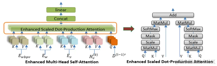Decoder端,使用EnhancedMulti-Head Self-Attention对 early fusion和deep fusion的编码特征以及视频帧特征进行融合[6],其结构如图所示: