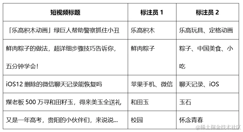 短视频一般由短视频文本标题、封面图、视频内容等元素组成,要想较准确的抽取出内容标签,需要综合利用这些多模态信息。如何将这些不同模态的信息融合起来应用于模型中并取得较好的结果是需要较多的探索;又因为内容标签是一个开放集合,如何判断哪些词语可以作为内容标签也是比较困难的。在实际人工标注过程中发现,两个人同时标注同一批数据,标注的完全一致率只有22.1%,以下是一些标注例子: