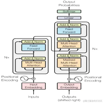 “候选生成+排序”的结构本质上是一种抽取式的标签生成方式,即生成的标签主要是在标题中出现的词或短语。相比抽取式,通过端到端训练的生成模型具有比较好的语义抽象能力,其生成出来的标签不需要出现在原文。2017年Google提出Transformer模型,其强大的特征提取能力和并行化带来训练速度的提升,使其在多项文本生成任务中达到了SOTA的效果,其模型结构如图所示。