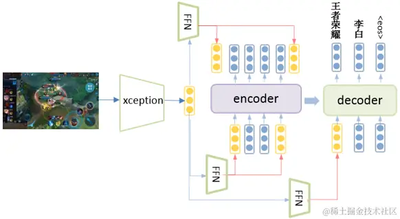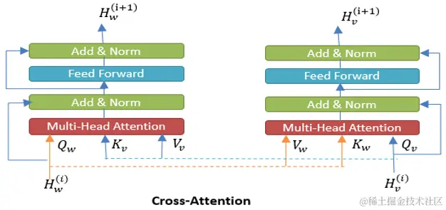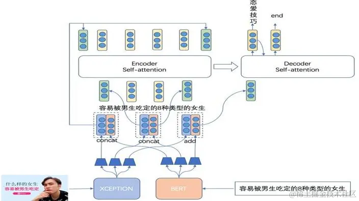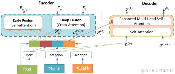 Encoder端,将文本特征、文本BERT特征、封面图特征、视频帧特征concatenate,然后经过self-attention进行Early Fusion;将文本特征、视频特征,通过交叉query, key, value, 经过cross-attention进行 Deep Fusion[5],其结构如下图所示: