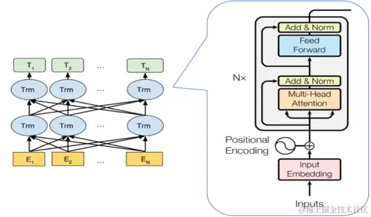 由于多模态模型的文本部分主要采用站内的短视频标题进行训练,训练集偏向于影视剧/娱乐领域,因此这会导致模型对于通用领域的文本语义理解有所欠缺,比如当模型对标题为“容易被男生吃定的8种类型的女生” 的内容进行分析时, 模型根据站内的数据训练得出结果为“女生”,然而更合适的标签应该为“恋爱技巧”,因此我们希望预训练模型可以解决这种问题。为此我们引入了目前表现最好的预训练模型 BERT。BERT是基于Transformer的深度双向语言表征模型,基本结构如下图所示,其本质上是利用Transformer结构构造了一个多层双向的Encoder网络。