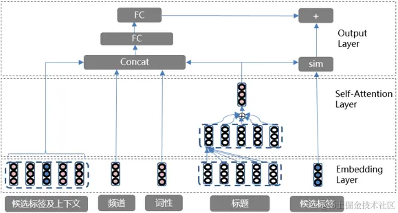 排序模型使用基于注意力机制的语义相似度模型[1] [2] [3],通过注意力机制生成短视频标题的向量表示,然后和候选标签向量做语义相似度计算,再通过划定阈值选取合适的标签。模型架构如下: