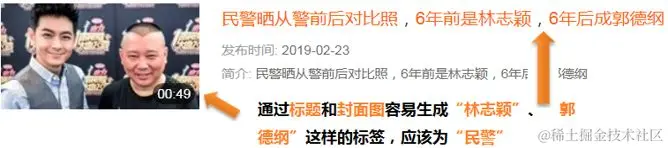 a) 标题为“此‘八卦’非彼‘八卦’,看完视频后觉得,脑子是个好东西!”, 通过分析文本和封面图等信息,会打上“八卦” 标签,而视频内容为“陈翔六点半”;