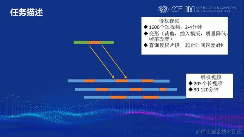 视频版权监测赛题的核心任务是在两个视频中找出内容相同,画面相似的视频片段(即拷贝片段),拷贝片段长度是几十秒至几分钟的视频图像。所谓内容相同是指指观看者看到的语义信息相同。画面相似包括不同形式的图像变形,如画面剪裁,饱和度改变,加字幕和LOGO,视频剪辑等处理。