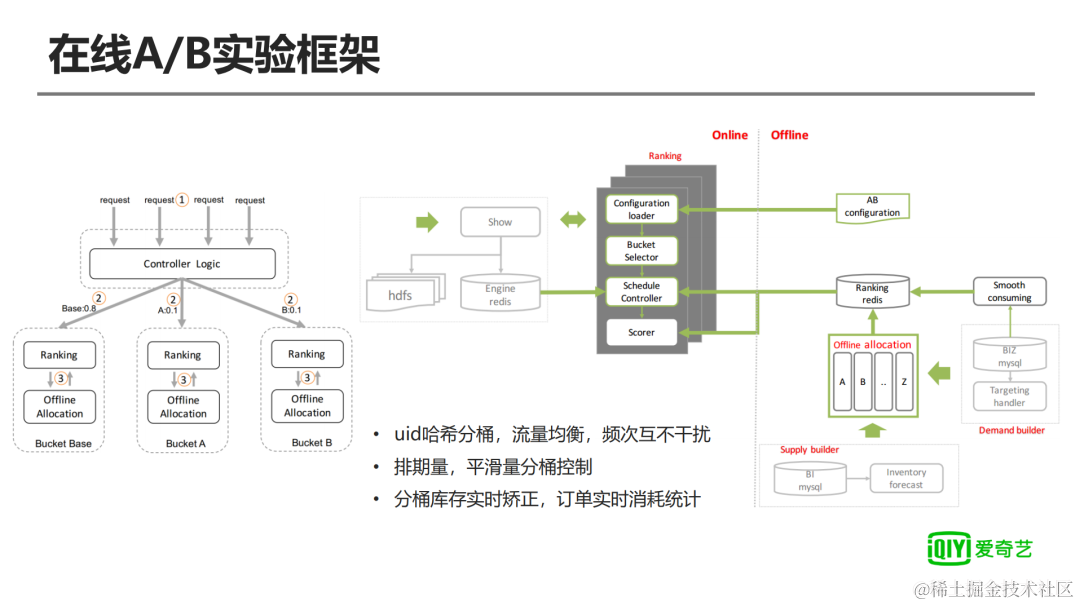 因为库存分配其实是全局优化问题,针对这样的全局优化问题我们怎么来进行A/B实验呢?首先我们通过UID哈希分桶的方式做一个线上流量切分,好处是保证流量相对比较均匀,并且有用户之间的频次,频次后面会有详细介绍,频次是互不干扰的。