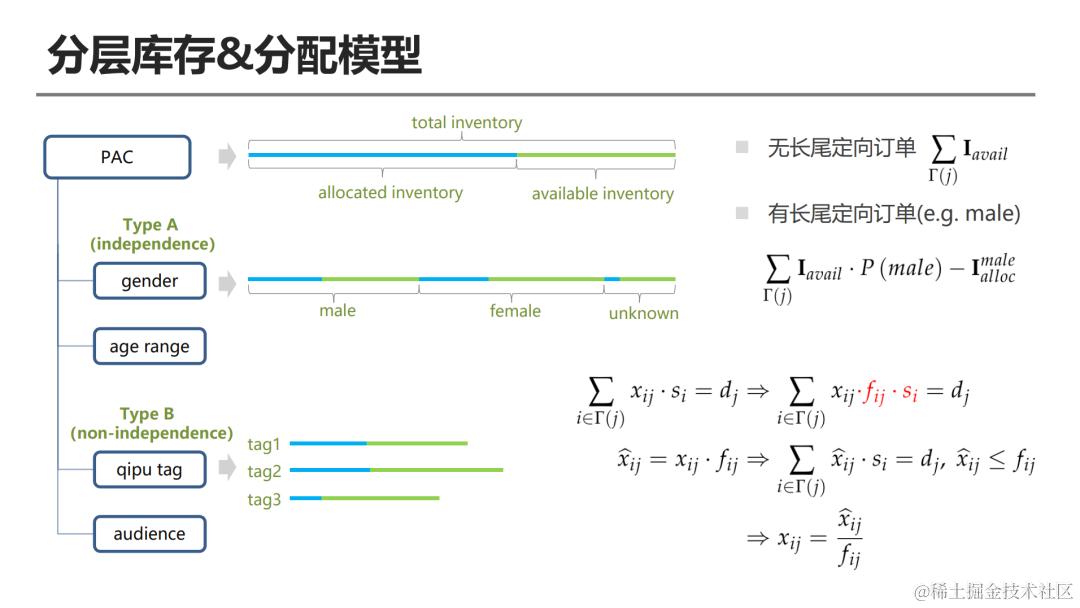 并且整个扣减过程也很简单,因为对于有长尾定向的订单而言,我只需要记录它在每个核心维度下的可用占比,我这里标注为fij,我可以过xij尖等于xij×fij的方式来进行替换,替换以后,整个算法的求解过程并没有受到任何影响,只会在最后引擎在线上代理选单时做一个调节,因为引擎天然在侯选订单筛选的时候,已经做了一个流量的筛分,所以对订单而言,在这个维度下可用库存已经变成了si×fij,整个求解和最后的选单过程的嵌入是相对比较顺利的,整个投放我们之前也验证了,对线上有较大效果的提升。