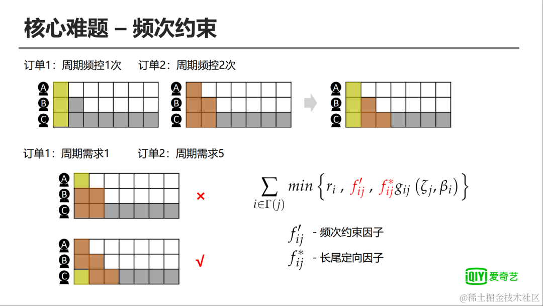 因此怎么去优化这个频次问题对整个线上效果投放影响会非常大,我们先不考虑整个系统里面所有订单互相挤占的因素,去计算出来一个fij撇表示这个频控下的可用库存,我们在计算订单扣减顺序时,会把fij撇的约束考虑进去,相同定向下,这个fij撇越小,那么它会越优先进行一个扣减。