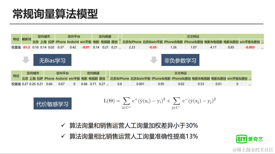 但是,如果出现参数为负的情况,可能出现就是广告主新增定向来询量以后返回给他的库存更少了,这显然符合大家的一个认知,会让广告主对询量的结果产生质疑。为了解决这个问题,我们采用了无Bias学习和非负参数学习,首先就是把Bias项给去掉了,并且在整个FM参数迭代过程中,加入了参数非负的限制。通过这两个优化以后,整个模型的询量自洽性相对会变的更好一些。