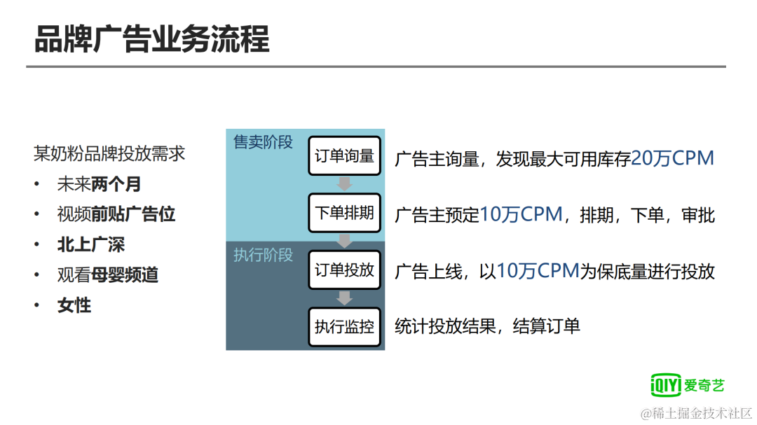 整个品牌广告的业务流程大致可分为售前和执行两大阶段,售前也是广告主确定广告购买意向的过程。举个例子,比如说某奶粉品牌,希望将它的广告投放到未来2个月的视频前贴片广告位,覆盖北上广深观看母婴频道的女性。广告主会向爱奇艺发起询量,爱奇艺会反馈在定向条件下的最大可用库存,比如说是20万CPM;那么广告主会根据自己的预算和需求、销售沟通,最终广告主确定需要预定10万CPM的量,那么他们就进行排期、下单、审批,最后成为正式的广告合约订单。