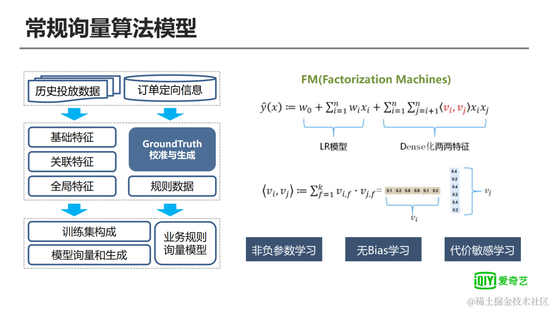 这样的好处是我们可以保证整个前贴片广告售卖的稳定性,包括订单的多样性,从而更好的利用用户的一个频次数据。目前我们采用的回归模型主要是FM,并且在此基础上我们又加入了非负参数学习、无Bias学习、代价敏感学习等,主要是为了使最后的结果更符合业务场景。其实,在这基础上,我们还做了包括标深的一个GroundTruth的校准和生成,在这个常规询量的回归模型里面,这也是个非常重要的问题。