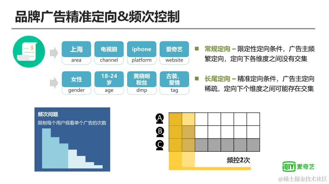 在此基础上,我们会开放很多精准定向给到广告主,比如说性别、年龄的一些定向,包括视频Tag、人群包之类的一些定向,这些定向有一个特点,就是广告主这些定向的订单相对会比较稀疏,并且各个维度之间可能存在交集。