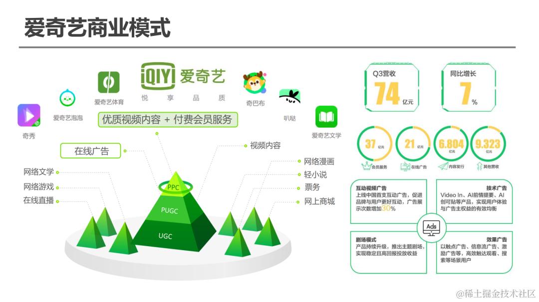 爱奇艺的核心商业模式是优质视频内容+付费会员服务,在此之下是在线广告。\