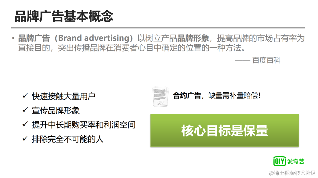 品牌广告的核心目标是广告主希望在用户心里树立起一个品牌形象,主要有以下几个特点:快速接触大量用户、宣传品牌形象、提升中长期购买力和利润空间、排除完全不可能的人。一般来说,视频平台在和广告主签订品牌广告时,会约定广告的声量,因此品牌广告算法核心的一个优化目标就是保量。