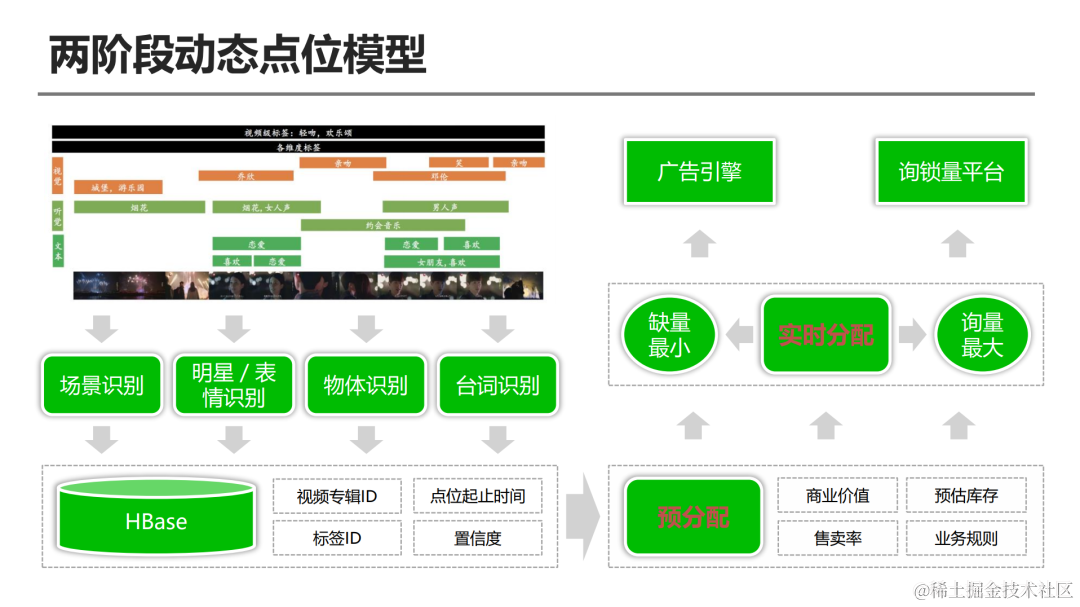 我们把这个解决方法称为两阶段的一个动态点位模型,首先视频的点位是通过抽取一些关键帧,通过图像相关的一些深度模型打上各种各样的点位。这些点位存入到HBase,里面会有点位的各种信息。算法侧会有一个定时的预分配任务,预分配任务主要是根据各种业务规则对AI里面同步过来的所有点位进行一次预筛选,业务规格会非常多,包括说两次广告展现不能超过1分钟,相同的一个点位在同一个视频内不能曝光多次,包括前2分钟之内不能出广告等等。