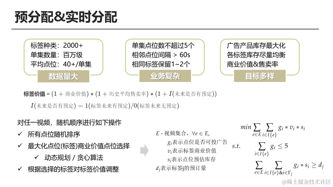 在此基础上,把每个标签每个视频预处理完以后的点位给到一个实时分配,整个实时分配系统跟之前的库存分配类似也是定义了一个优化目标,整体优化目标使得分配点位商业价值是最小的,这样可以保证剩余的那些未分配的视频它的商业价值更大,这样从售卖角度,可以更好的去进行后续的售卖。