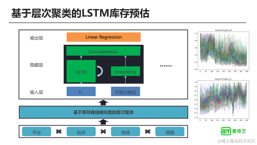 层次聚类的LSTM预估模型,是给各个维度的库存定义了一个相似性,根据历史库存的波动和趋势,把这些波动和趋势和相近的一个维度聚合成一类,每一个聚类下共同训练一组参数,这样的话我们同时可以解决样本和资源问题。每个聚类因为有很多维度下的数据,它的样本量可以得到一个解决;同时,同一种聚类只训练一组参数的话,对整个资源的消耗也是比较大的节约,可以看到整个聚类以后,每个聚类里面库存的历史其实是相对比较接近的。另外在此基础上,我们做了一些其它的优化,节假日方面也做了优化。