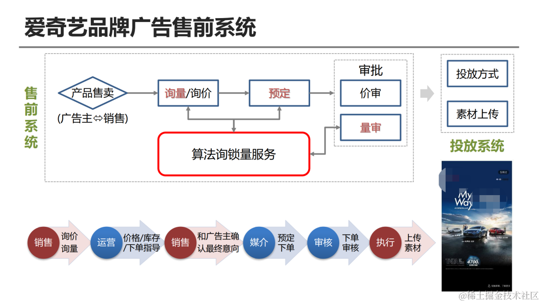 大概整个流程中,对应的各个模块都有服务的系统,在这些系统里面算法也起了很多的作用,我们把它统一称为询锁量服务,比如说一开始有销售跟销售运营要沟通询量,会通过一个询量的平台,然后请求算法的询量服务,告诉广告主,你这样一个定向条件下,有多少的库存可以使用,可以给你进行一个预定。