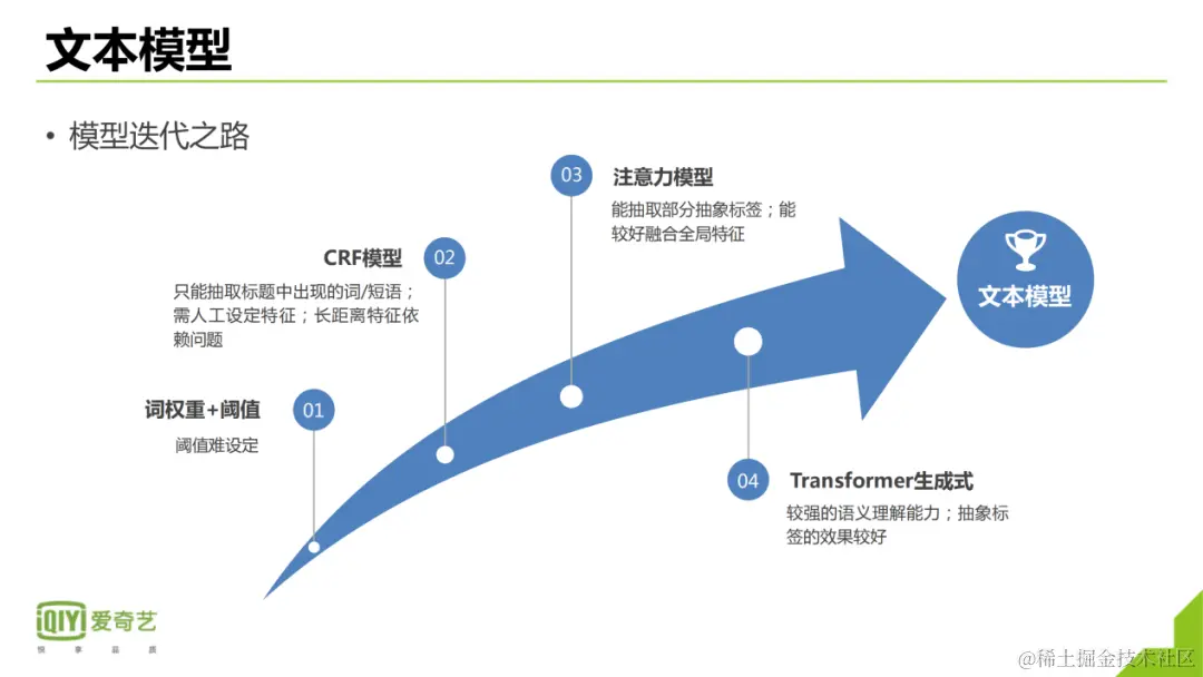 首先我们来看看文本模型,从词权重+阈值——CRF模型——注意力模型——Transformer模型,文本模型经过了一系列的算法迭代,具体如下:
