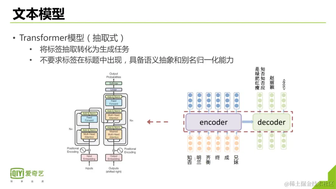· Transformer模型: 典型的生成式的模型,它是有比较好的语义概括的归纳能力,在抽象标签的效果也不错。