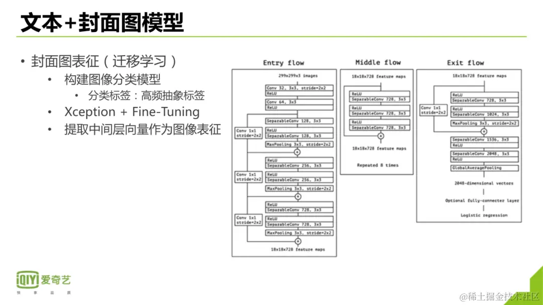 要想把封面图加入模型,首先面临的第一个问题就是怎么把封面图向量化, 其中会用到迁移学习,迁移学习目前在业界是应用比较广泛的一种技术,它使用大规模数据预训练好的模型在新的任务新的数据上进行Fine-Tuning,从而加快模型学习效率,使模型能较快的达到一个比较好的效果。我们的做法是使用ImageNet预训练好的模型,在我们的数据集上用这个模型去初始化一个图像分类的任务,分类的标签是图像对应标题的高频抽象标签。预训练模型我们比较了ResNet、Inceptionv3、Xception等模型,最终我们使用Xception来初始化我们的图像分类模型,然后抽取出倒数第2层2048维向量作为图像的表征。