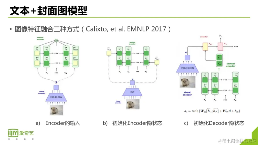 图象和模型融合的方式有三种:第一种方式是把图象向量作为一个token拼接到文本输入里面,一般的做法是拼接到文本向量的首尾。第二种融合的方式是设置图象向量作为Encoder隐藏层初始化向量,因为隐藏层的参数初始化有两种方式,第一种方式是初始化为0;,第二种是随机初始化,这儿使用图像向量作为隐藏层的初始化向量。第三种方式是将图像向量和Encoder输出向量融合,然后作为Decoder的初始向量。
