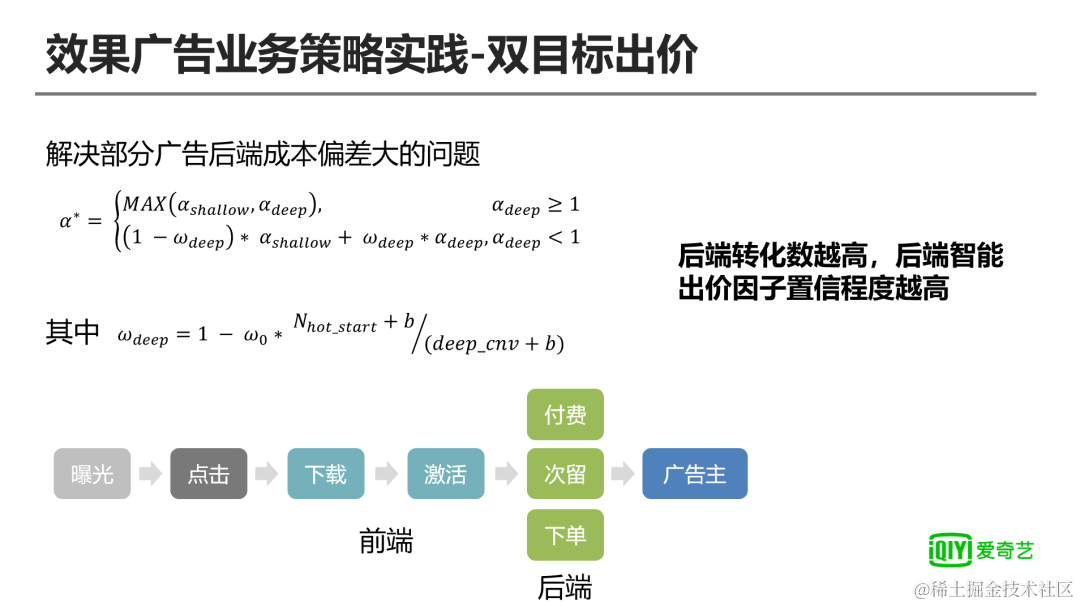 最后则是介绍在业务策略实践过程中使用的双目标出价逻辑,广告主在投放的过程中,通常会关注前端成本和后端成本,前端通常包括下载和激活等等,相对来说转化数较多的转化目标,后端成本则是包括付费、次留、下单等等,转化数据较少无法直接进行模型训练,为了保证广告主后端分差大的问题,根据广告主设置的前端转化成本和后端转化成本,我们分别设置计算其对应的智能出价因子和后端智能出价因子,后端智能出价因子处于放量状态选择两者之间最大的值进行放量,后端成本不满足/出现偏差大的时候我们对两者进行加全操作,权重由后端转化成本进行决定,后端转化数越多,在最终的智能出价因子中占比越高,最终实现广告主后端成本偏差小的问题。