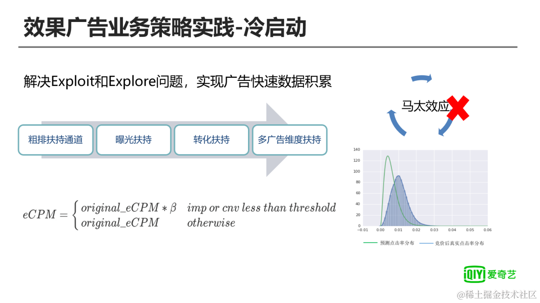 冷启动模块主要是为了解决Exploit和Explore问题,同时也尽量解决模型预估不准确的问题,模型预估不准确主要是由于在竞价后真实的点击率分布和预估点击率之间的分布存在差别,模型训练则是使用模型筛选出来的样本进行训练,从而形成马太效应。\