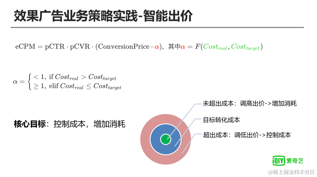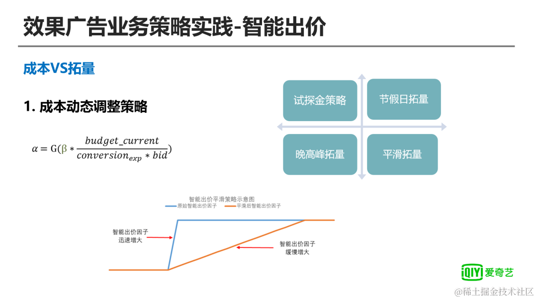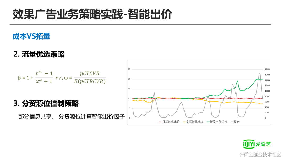 分资源位控制策略,在爱奇艺广告投放的过程中具有多个不同的广告资源位,不同的广告资源位对应的转化成本和转化率也不一致,为了实现智能出价引资的精细投放,我们对资源位进行拆分,分别计算不同的资源位的智能出价因子,从而实现智能出价因子能够对广告进行精细化的调解,如右图所示在广告投放过程中当目标转化成本大于实际转化成本时,智能出价因子提高导致智能出价价格提升,可以获得更多的曝光量,从而实现广告的顺利拓量问题。