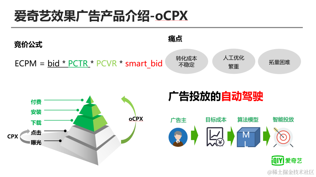 在CPX投放的模式下,竞价是通过ECPM来排序的,ECPM在CPX模式下等于bid乘PCTR,在CPX投放过程中广告主遇到右上角三个痛点;一是转化成本不稳定,效果广告的广告主大多是中小广告,中小广告主主要关注用户最终的转化,包括下载、安装和付费等等。CPX计费模式以点击进行计费,无法保证广告主后续转化率以及对应的转化数,从而导致转化成本不稳定的情况。第二是人工优化繁重,广告主在使用CPX计费模式的情况下,需要筛选出最优的曝光质量,从而保证从点击到后续的转化具有较高的转化率。广告主通过设置用户的定向条件来保证曝光质量,定向条件包括用户的性别、年龄、层次和频道等等,