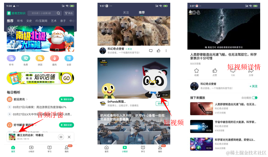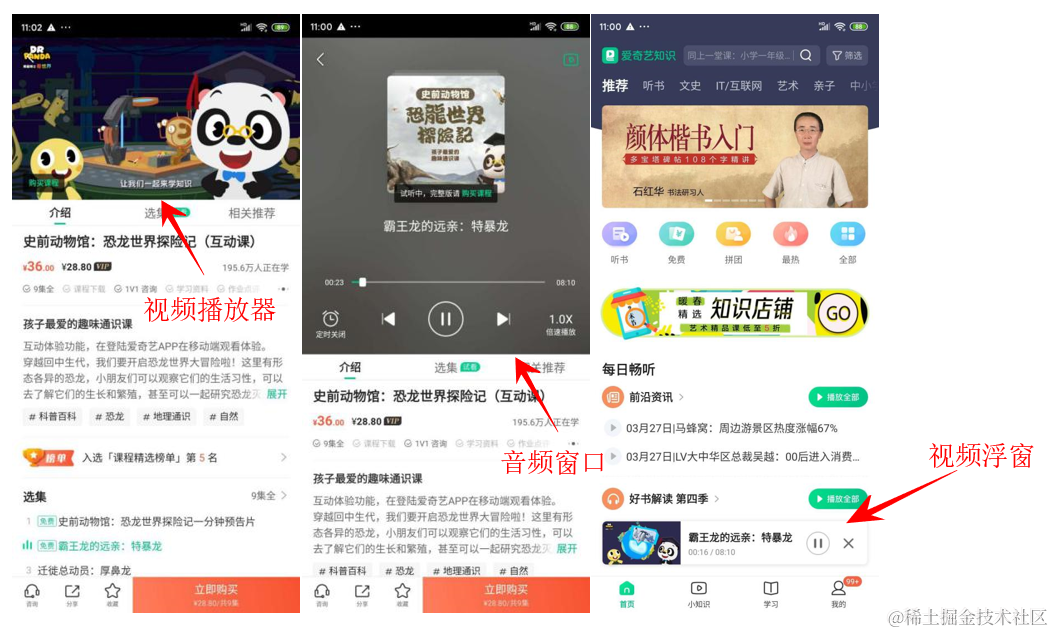 从上面产品形态效果图可以看出,爱奇艺知识播放器支持视频窗口、音频窗口、视频浮窗、音频浮窗、短视频窗口、短视频浮窗、音频控制台等多种场景播放,并且可以根据需要在保持播放的平滑流畅的同时随时切换。
