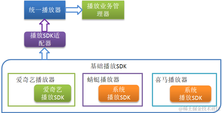 2)爱奇艺播放SDK和第三方播放SDK按照统一协议进行适配,提供基本的播放接口。保证上层业务对具体播放SDK无感知。