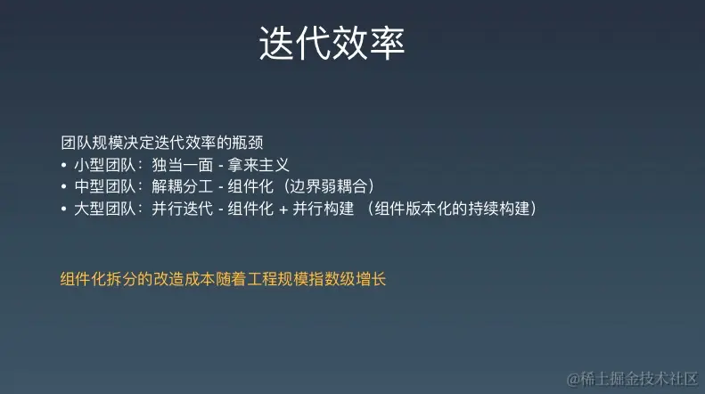 - 然后到了一个中型团队,一个人英雄主义承担不了这么大规模的东西。所以这时候就强调一种组件化解耦模块化,让大家专注在自己能做的事情上面。这个时候强调的是边界弱耦合的组件化。