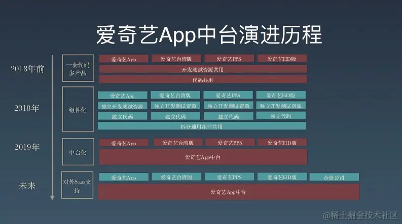 这个是爱奇艺中台演进历程。在 2018 年以前,当时爱奇艺的四大 App 基本上就是一套代码,同一个工程。后来每一个 App 都成立了一个单独的团队,我们把代码还有开发资源完全的隔离开,并且在这个过程中,将通用的组件给拆分出来。这个时候开始做大量的解耦工作。然后在 2019 年,一边做解耦,一边在搭建爱奇艺 App 中台。
