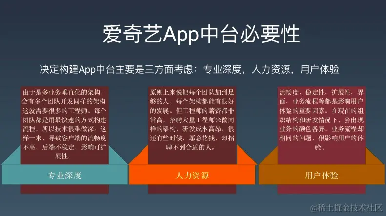 既然有了这么多的产品,那么就有了建立爱奇艺 App 中台的必要性。主要从三方面考虑,专业深度、人力资源、用户体验。