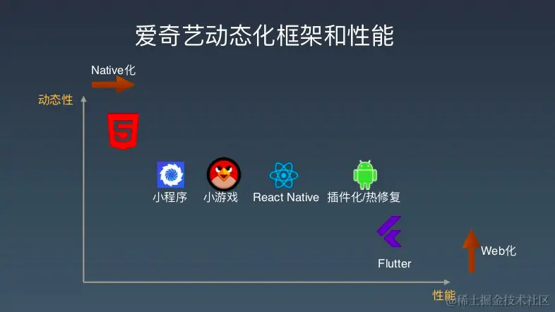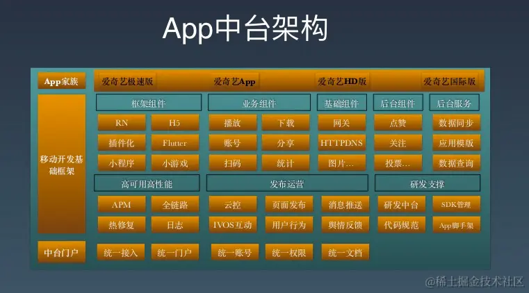 当然我们现在处于跨平台时代,所以爱奇艺中台也沉淀了非常多的动态化框架,其他 App 想用都是比较方便的。H5、小程序、小游戏,还有最近的 Facebook RN,还有自己开发的一些插件化热修复框架,以及 Flutter。