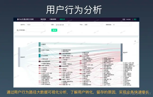 另外搭建了一个叫做用户行为分析的平台,可以看到每一个场景,每个页面的流量是从哪里过来的,这个主要是给产品同学用,能看到用户行为路径大数据的可视化分析,能够知道用户的转换留存的原因,辅助实现业务的快速增长。