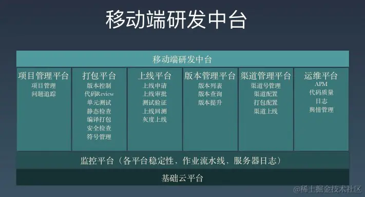 这个是中台的架构图,底层是中台门户。因为所谓的中台化就是企业级能力复用平台,所以中台化就是通过平台化去发现、沉淀跟复用企业级能力。所以最重要的首先是打造一个中台门户,提供统一接入、统一门户、统一账号、权限和文档的事情。上面是移动开发基础框架,提供从开发、测试到运营的一站式解决方案,包括一些框架组件、业务组件、基础组件,还有后台的一些组件服务;还有高可用高性能的平台,发布运营平台,研发支撑平台等。最上层就是支撑各个业务 App。