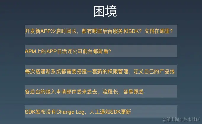- 曾经有团队反馈,他们一个 App 从立项到正式上线花了大概三个月时间,大量的时间花在寻找各种文档上,以及找各岗位帮忙对接的事情上。
