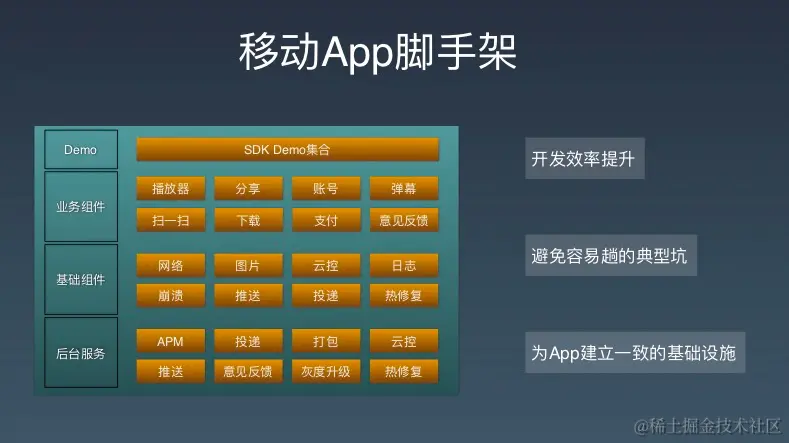 其次是搭建了一个移动 App 脚手架,将常用的一些功能、业务组件、基础组建、后台服务都陈列在脚手架上。脚手架有三大好处:提升开发效率,避免踩过的一些典型坑,以及为 App 建立一个一致的基础设施,方便做跨 App 的功能性升级。在新 App 已实验过,大幅提升了开发效率。