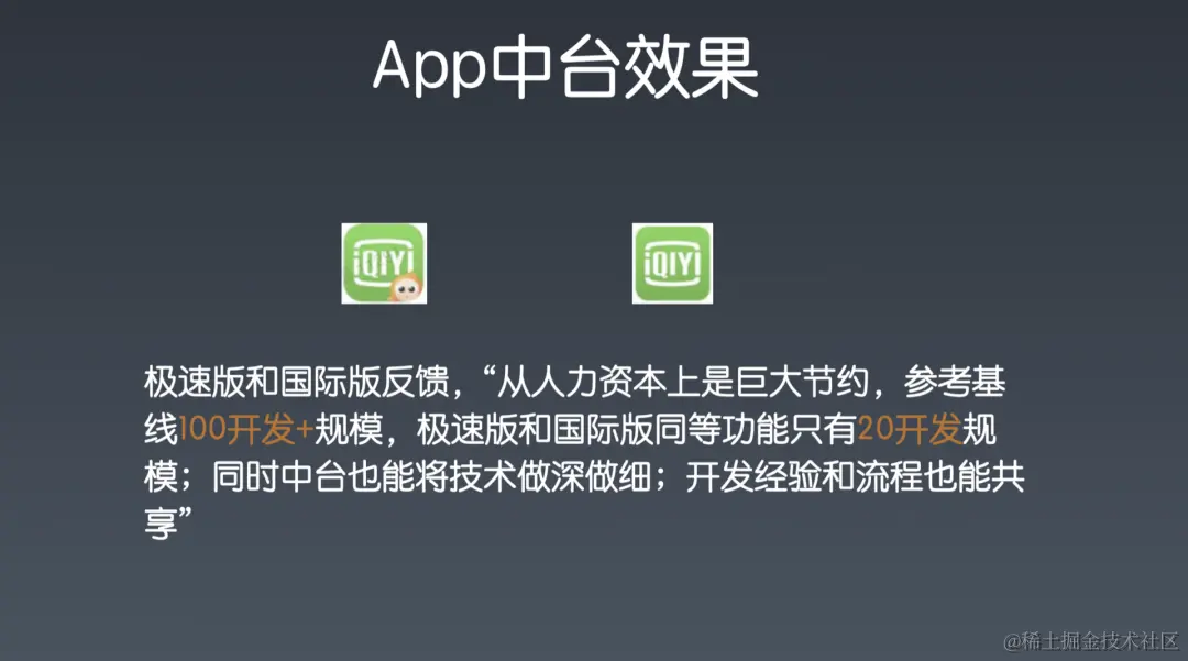 爱奇艺 APP 中台效果,跟中台合作最紧密的极速版和国际版就有这样的反馈,“从人力资本上是巨大节约,参考基线 100 开发 + 规模,极速版和国际版同等功能只有 20 开发规模;同时中台也能将技术做深做细;开发经验和流程也能共享”。