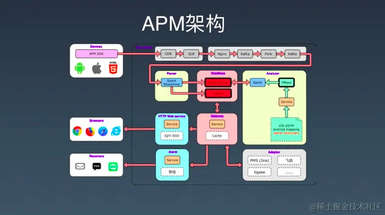 通过对一些设备进行数据采集,经过 CDN 和 QLB 的 Balance,然后再到 Nginx,最后收集到 HBase 和 ES 里面。经过符号解析,到前端展示。一旦报警,通过内部 IM 或者邮件进行通知。