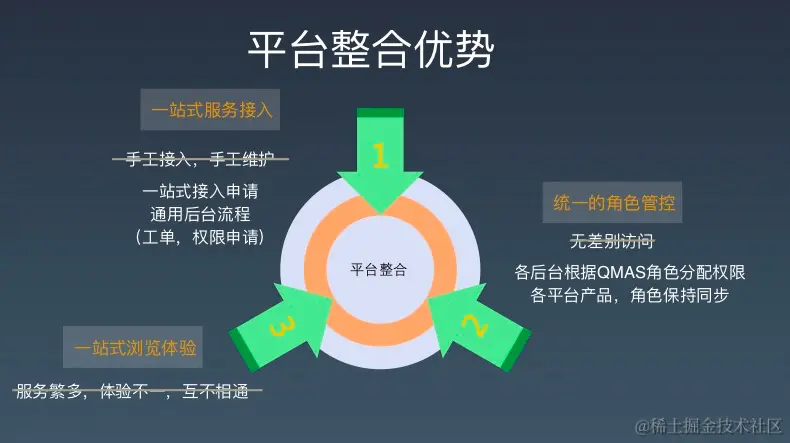 针对上面提到的情况,开发了我们自己的中台叫 QMAS。平台整合有三方面优势,第一:一站式服务接入,提供一些工单权限申请。第二:统一的决策管控,各平台不会存在角色之间互相不一致的情况。第三:一站式浏览体验,尽量抹平各个平台存量差异,然后直接在 QMAS 上进行增量平台开发。