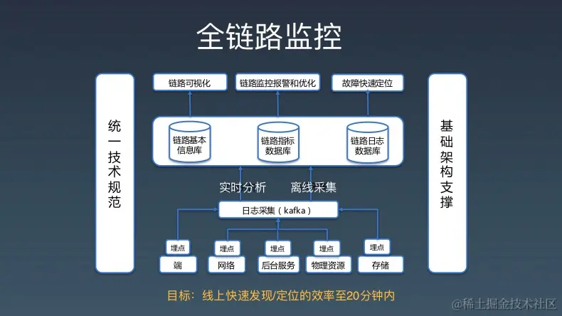 除了 APM,我们成立了一个虚拟团队,在打造一个全链路的监控平台,主要作用就是通过统一的投递规范,然后收集整个端到端的日志、链路数据,实现链路可视化。可以非常方便的看到链路瓶颈,进而做一些可优化的事情。另外可以做监控报警,实现故障快速定位。目标是线上定位问题的效率能够缩短至 20 分钟。