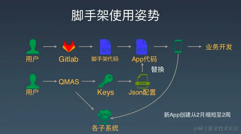脚手架使用姿势也比较简单,首先是把代码拉下来,在 QMAS 上把各种后台申请下来之后,保存在基层配置里,之后基本上就能跑起一个可运行的 App 了,然后在上面再进行自己的业务开发。我们测出来一个新 App 的创建,大概从两个月左右缩短到两周,因为以前的很多繁冗的操作都不需要了。